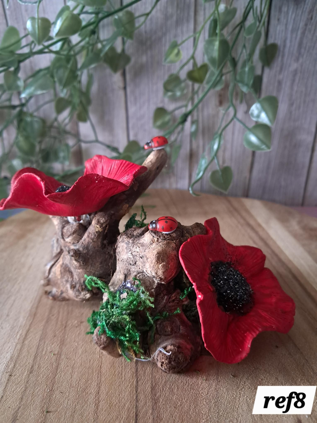 🌺moyen Coquelicot décoratif artisanal – Argile autodurcissante & bois flotté ref4