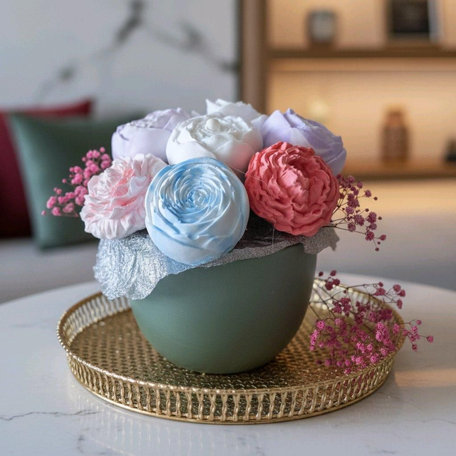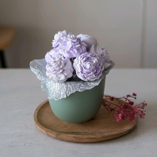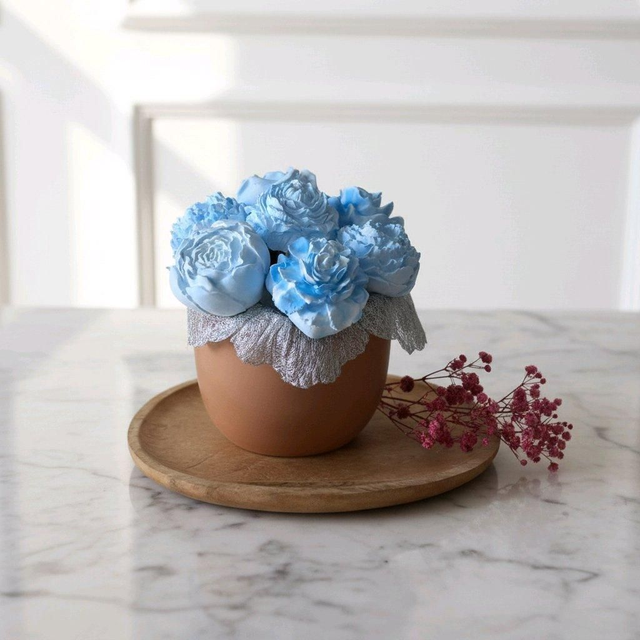 Chaque fleur est réalisée en résine naturelle, minutieusement travaillée pour imiter la finesse des pétales et créer un ensemble élégant et intemporel.